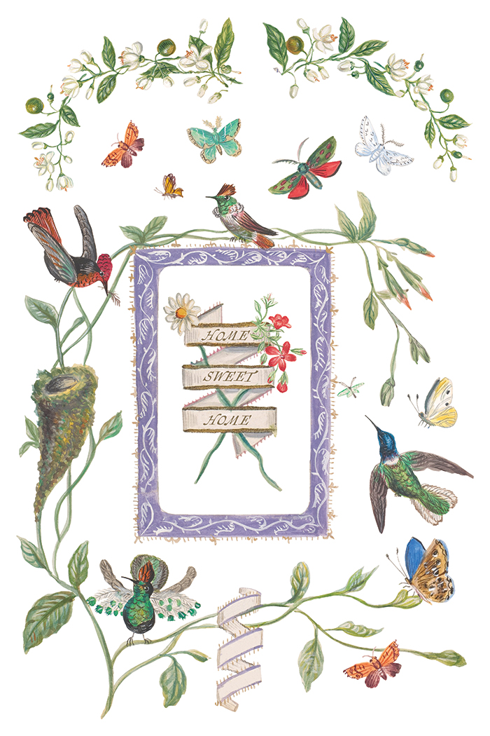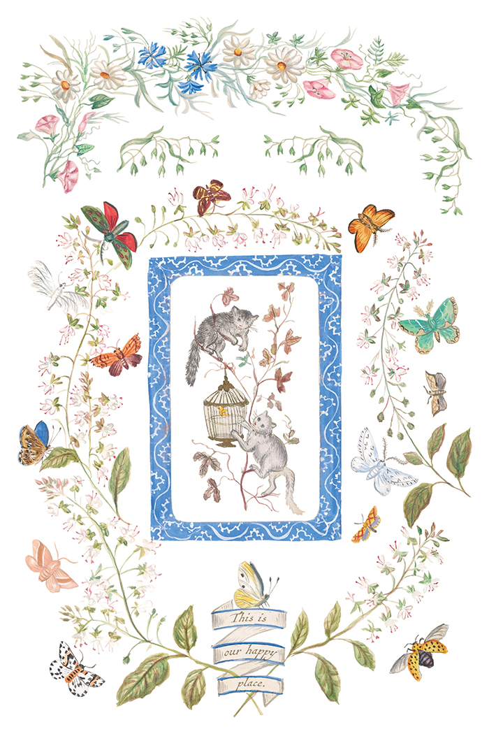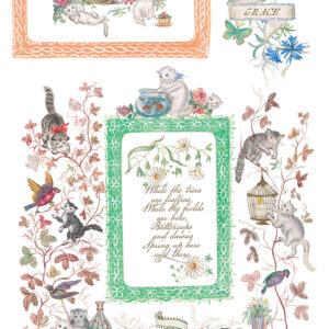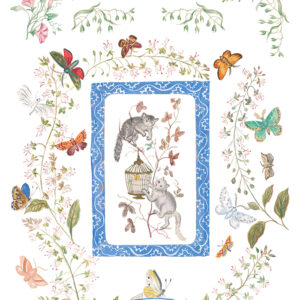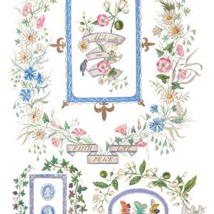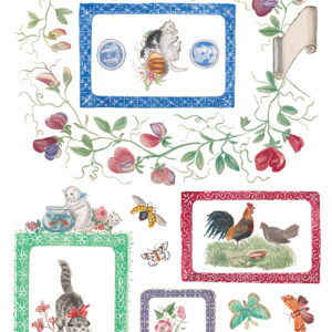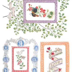 The Emily Claire – 8-Page 8×12″ Transfer Pad comes from one of our favorite archive finds to date. Taken from an 1868 family album belonging to Miss Emily Clare Harvey, the artwork began as her pencil and watercolor illustrations lovingly added around her family’s portraits. The Cooper Hewitt preserved the album, and when we discovered it, Sam (our Senior Designer) and Sally immediately fell in love with its whimsical, beautifully hand-painted details. The set includes charming elements like kittens, hummingbirds, butterflies, banners, and even a proud little rooster—each one quirky, delicate, and full of character.