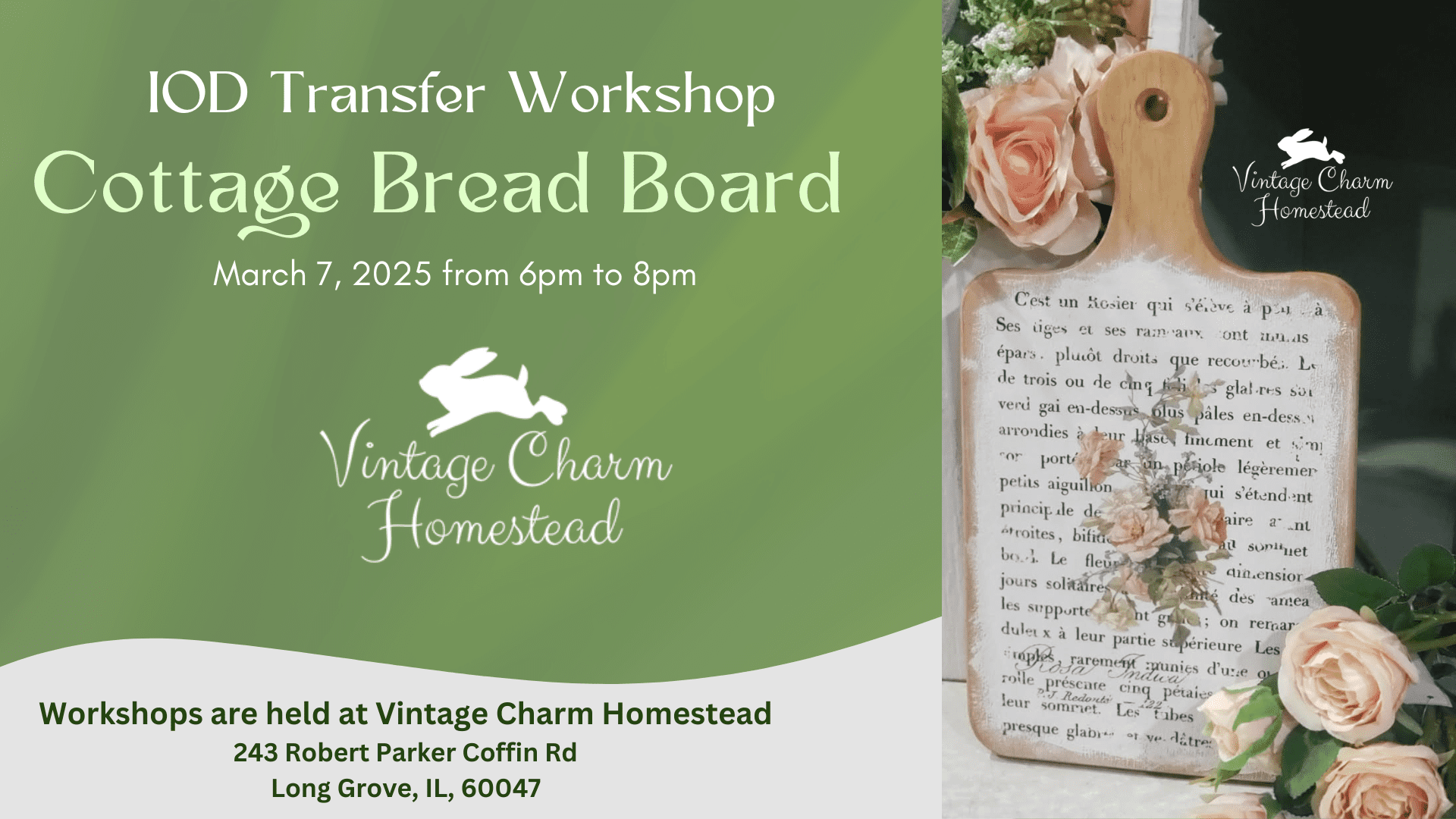 This workshop takes place inside of Vintage Charm Homestead at 243 Robert Parker Coffin Rd, Long Grove, IL, 60047