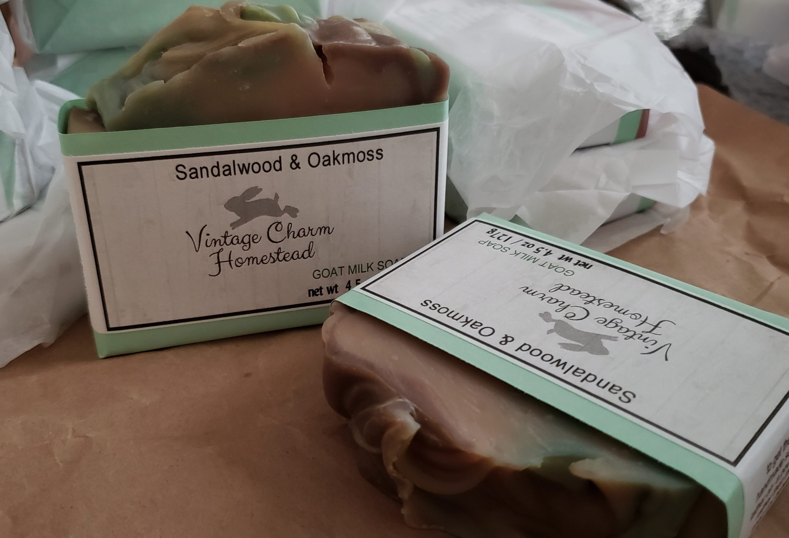 Sandalwood & Oakmoss is another lovely earthy scent. Sandalwood is a soft almost sweet scent with floral and woodsy notes. And although is has floral notes, Sandalwood is a perfect companion for the woodsy scent of Oakmoss. This is probably why woman and men both love this soap. All of our soaps are handcrafted in small batches with a cold processed technique. After a full 6 week cure time for a hard long lasting soap, each bard is wrapped and labeled with care. The soap is hand-cut to 4.5 ounces or slightly more depending on any additives, such as ground oats, coffee grounds, or other botanical additives. Because these are hand crafted you will see variations in color, this is the nature of a handcrafted product.